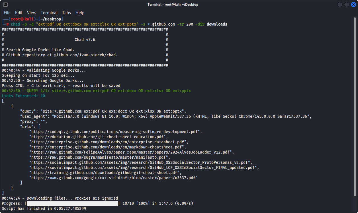 chad -p -q "ext:pdf OR ext:docx OR ext:xlsx OR ext:pptx" -s *.example.com -tr 200 -dir downloadsChad's file download feature is based on Python Requests dependency.